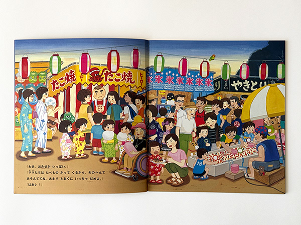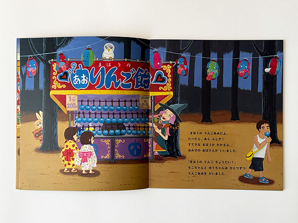 ちこちゃんとゆうちゃんはお母さんたちと夏祭りにやってきました。色々な屋台が出ていて、わくわく。ちょっとあやしげなお店でりんご飴を買うと…。お祭りのドキドキワクワク感満載の絵本。